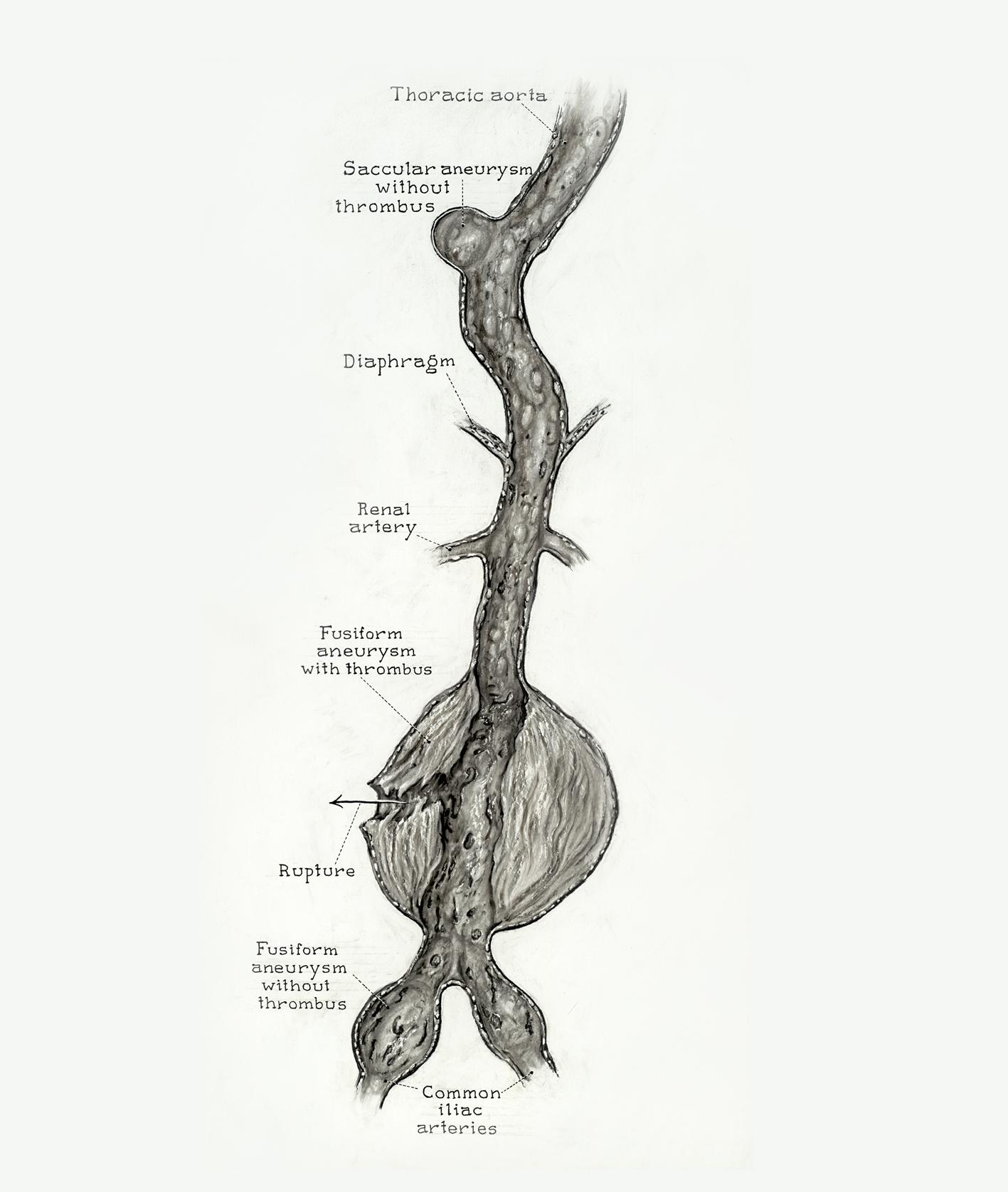 An aortic aneurysm is an enlargement of the aorta due to a weakened area on the wall. This vulnerable section could lead to a bulging hole called a rupture, allowing blood to leak into the body. Another abnormality of the aorta is aortic dissection. A dissection is a split between the layers of the aorta that traps blood coming from the heart.